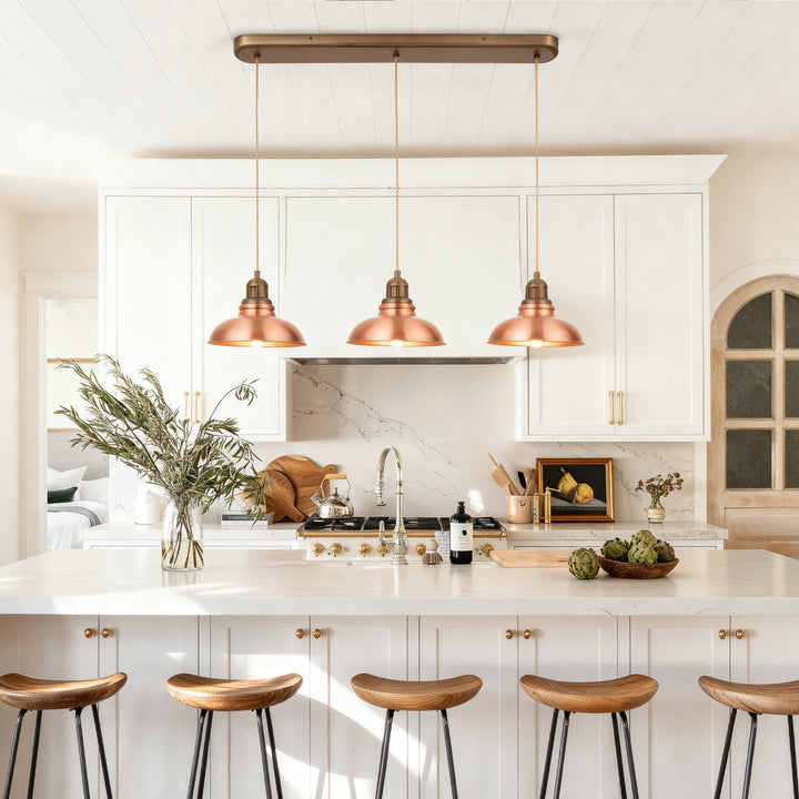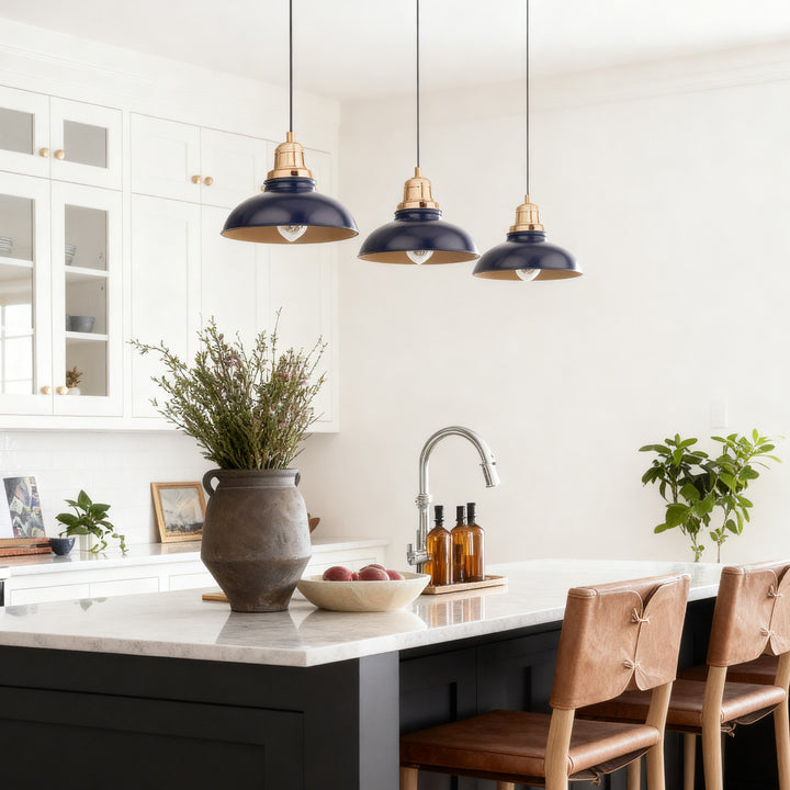 The ceiling light blends industrial charm with modern elegance, featuring three sleek dome shades in stylish finishes.