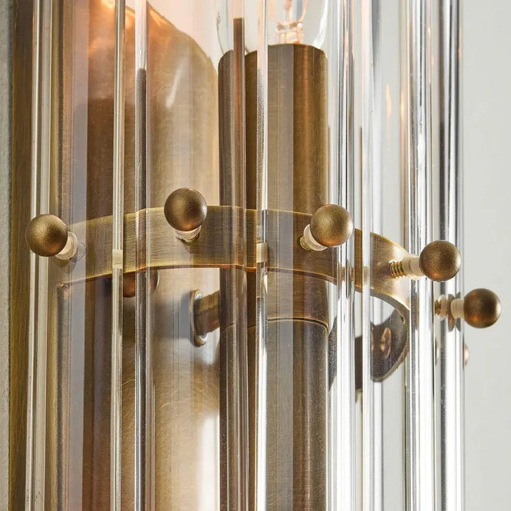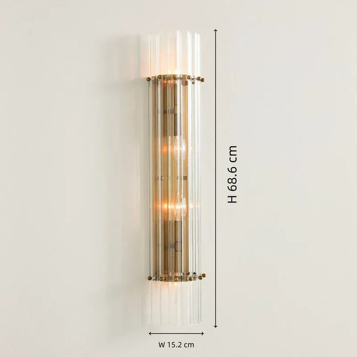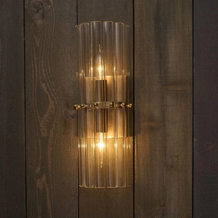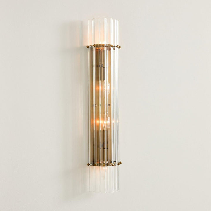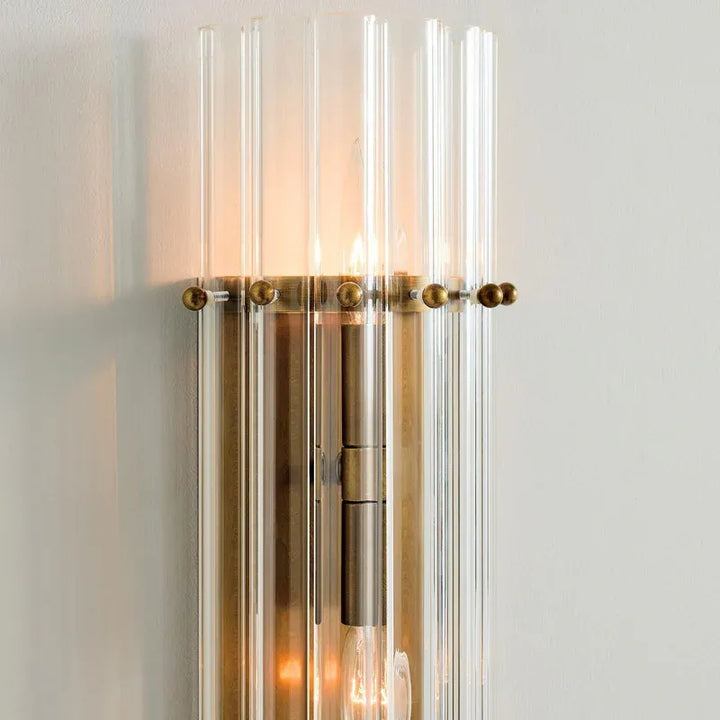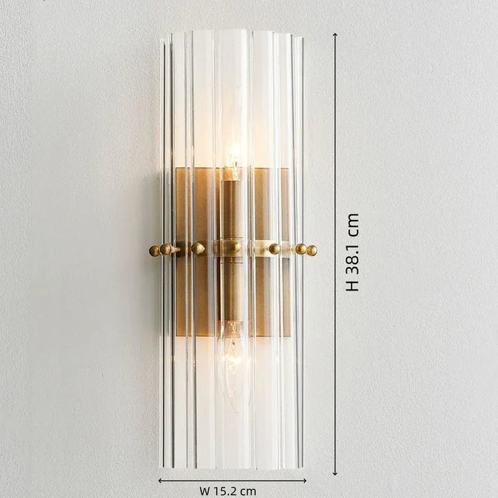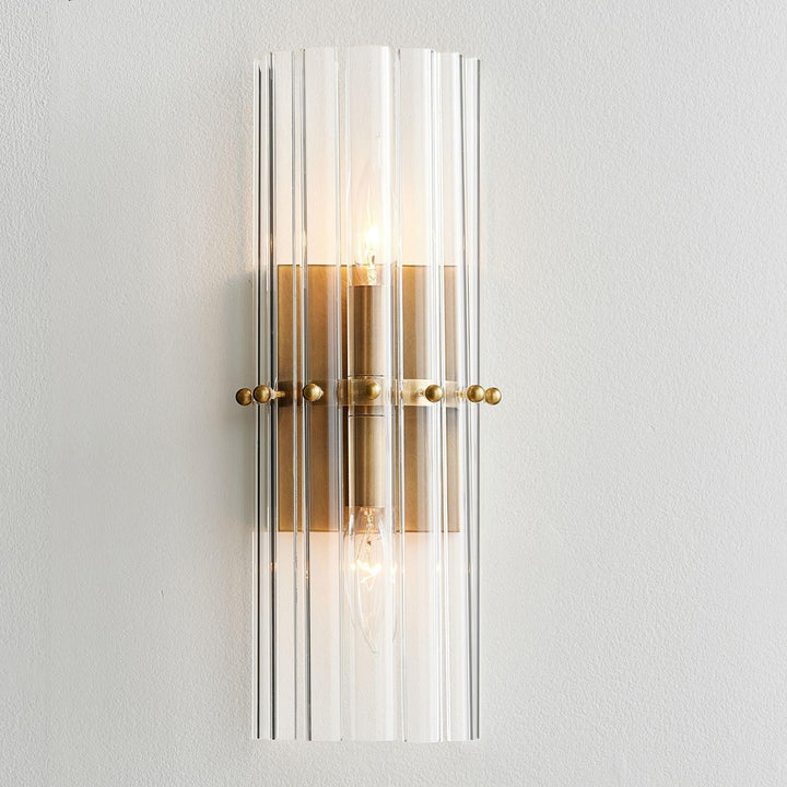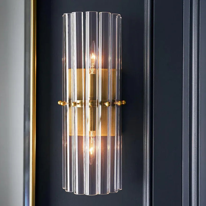Elevate your space with the wall sconce: ribbed crystal panels with a warm brass finish. Perfect for hallways, bedrooms or flanking mirrors.
