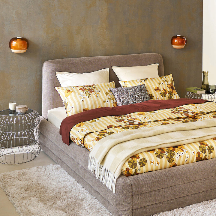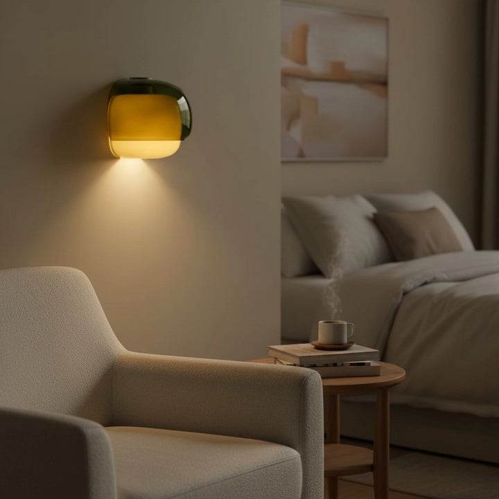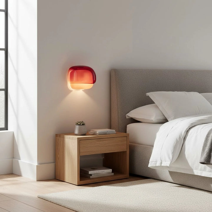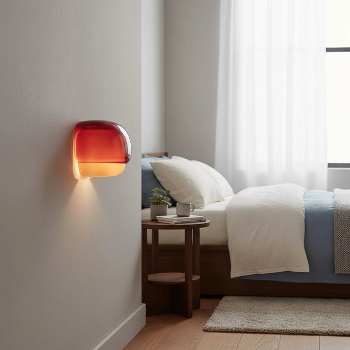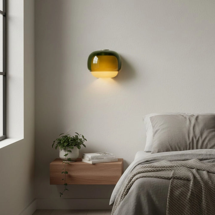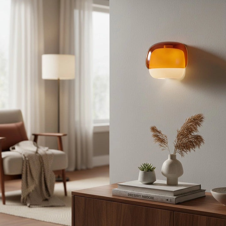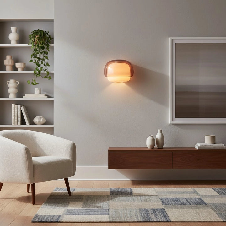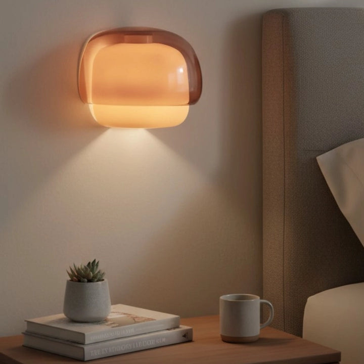 This charming wall lamp features a double-layered mushroom-shaped glass shade. Its playful yet elegant shape emits a soft glow that complements any home.