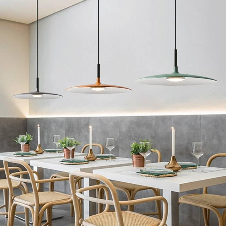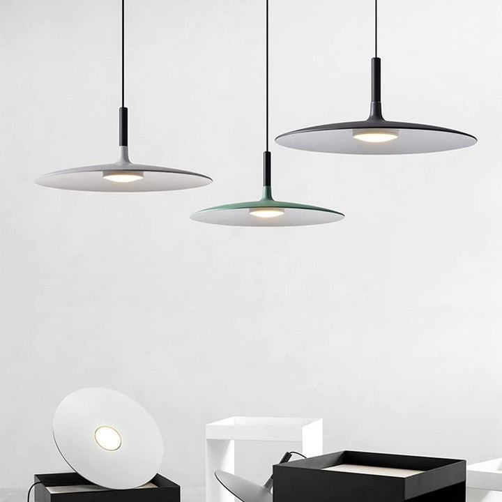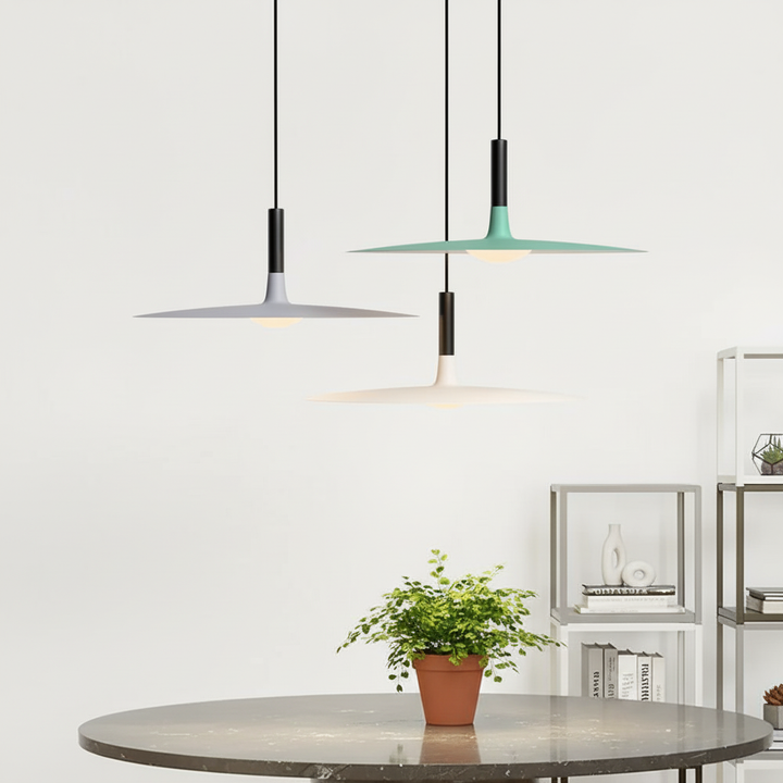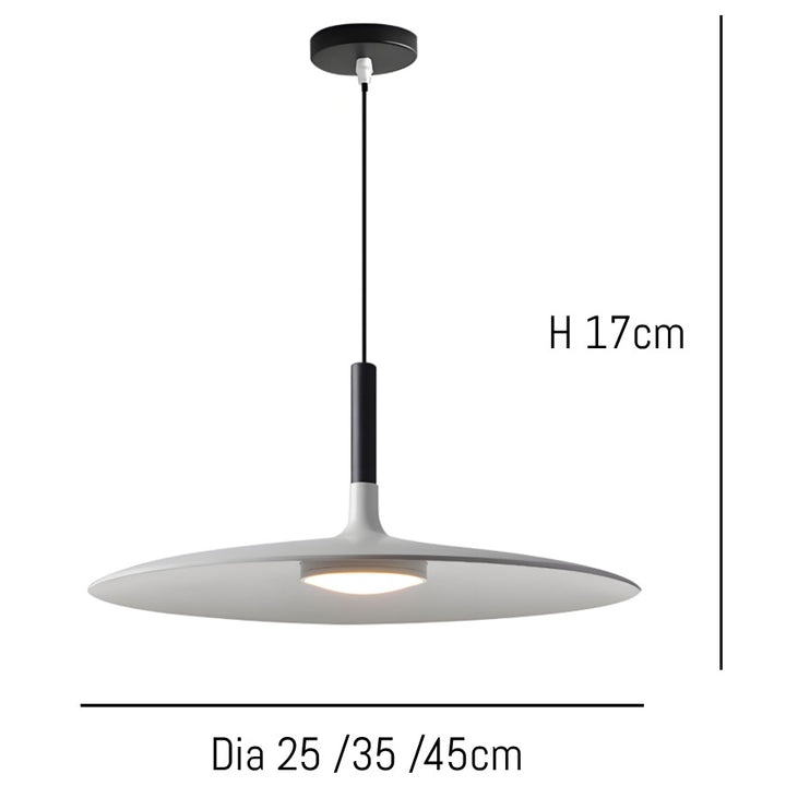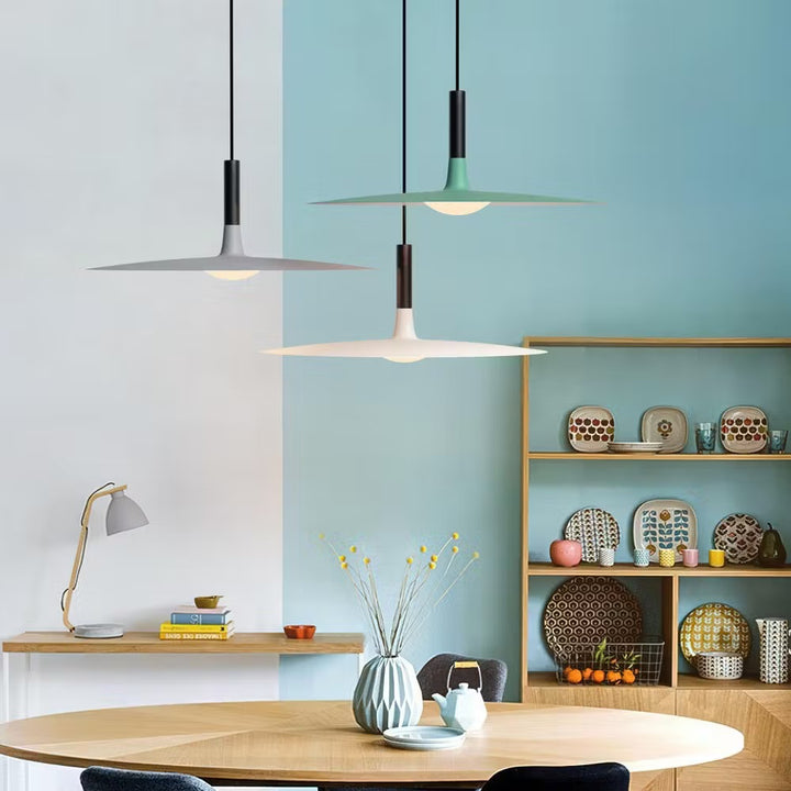 With its simple yet innovative flat shape and generous opening, this pendant lamp is perfect for covering a tabletop or defining a space with a clear and even light.