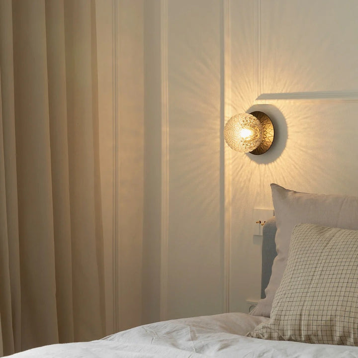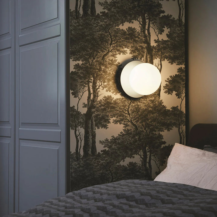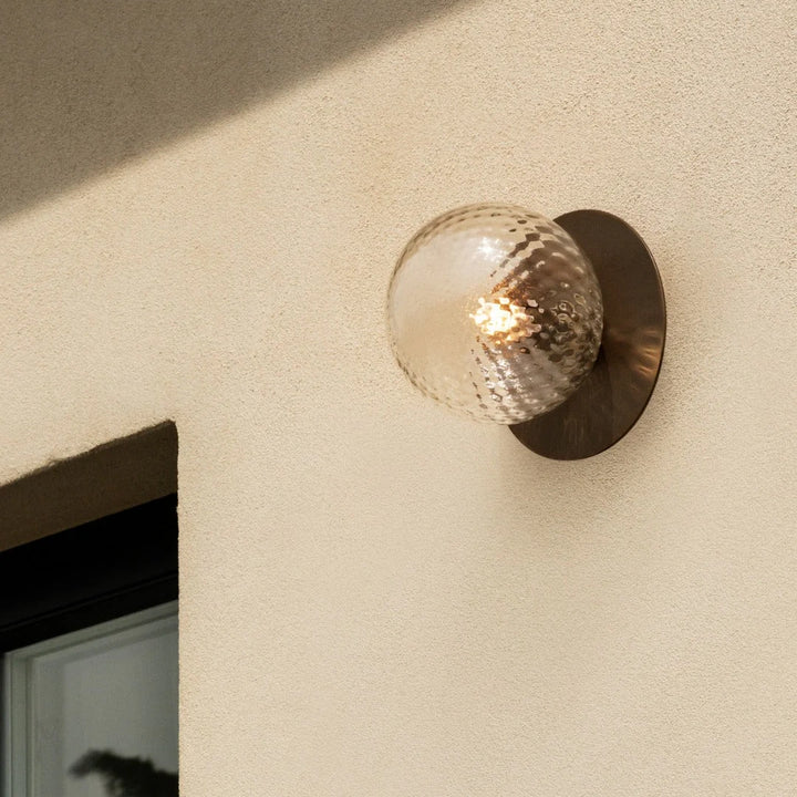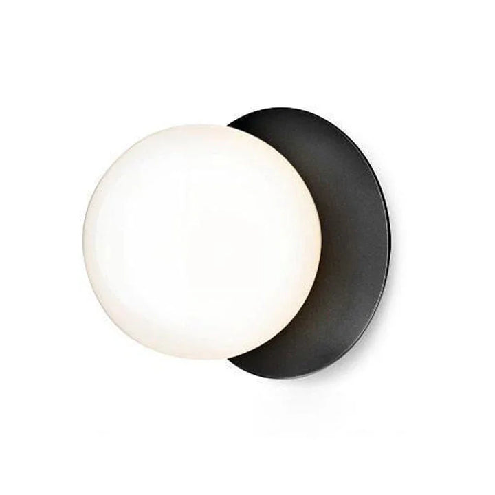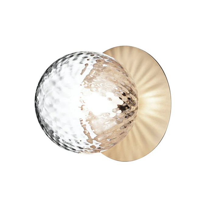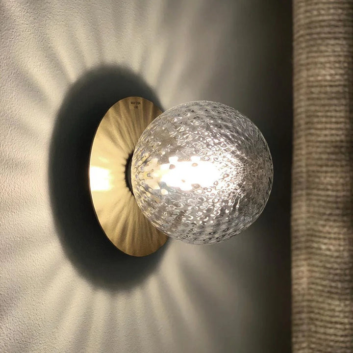 This wall lamp features a sleek metal base and mouth-blown glass sphere, perfect for walls or ceilings, adding elegance to spaces.