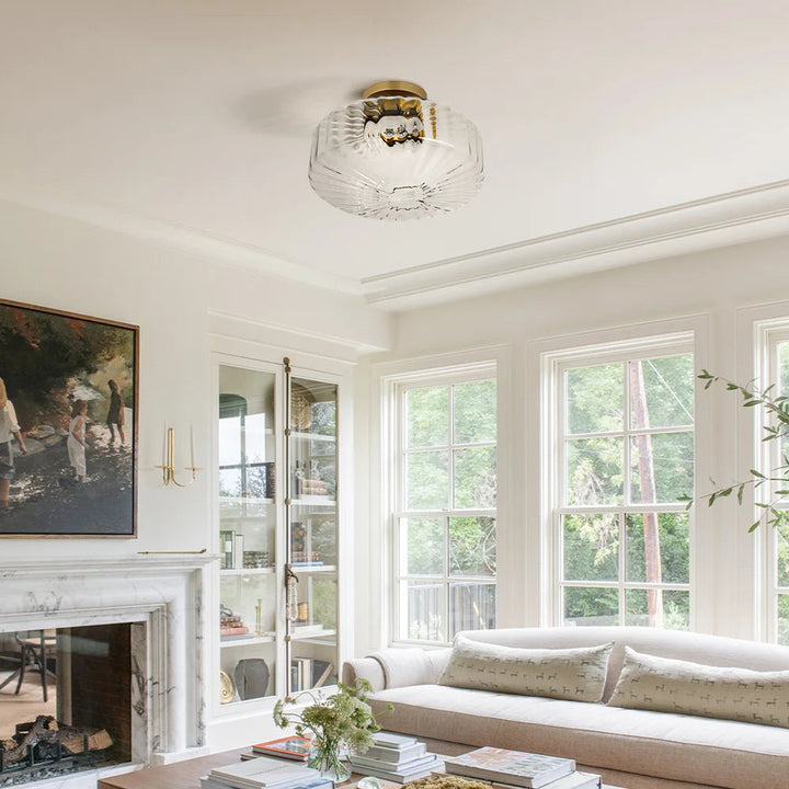 Modern meets timeless in this Ceiling Light, featuring a ribbed glass shade paired with a warm brass base. Perfect for multiple spaces.