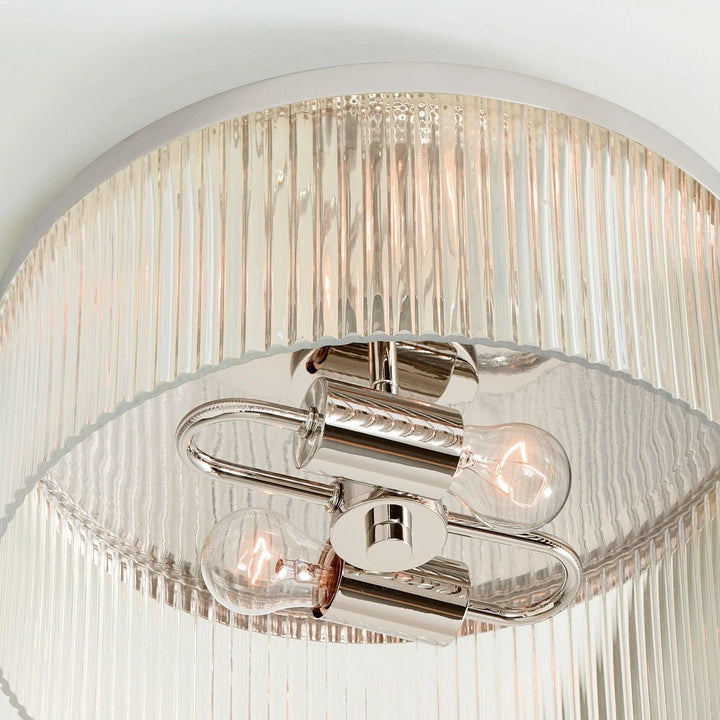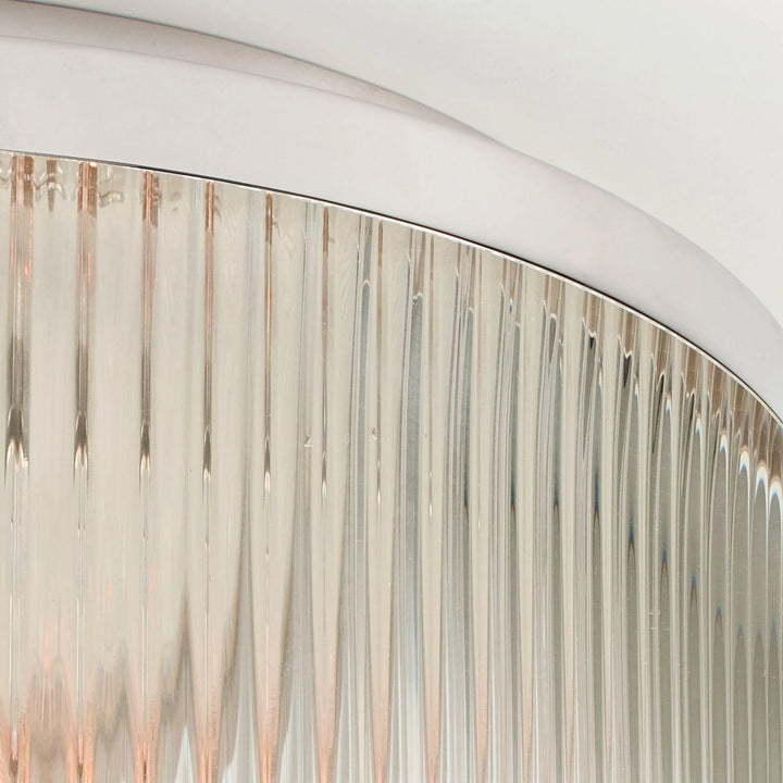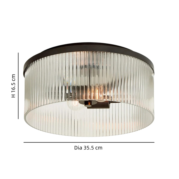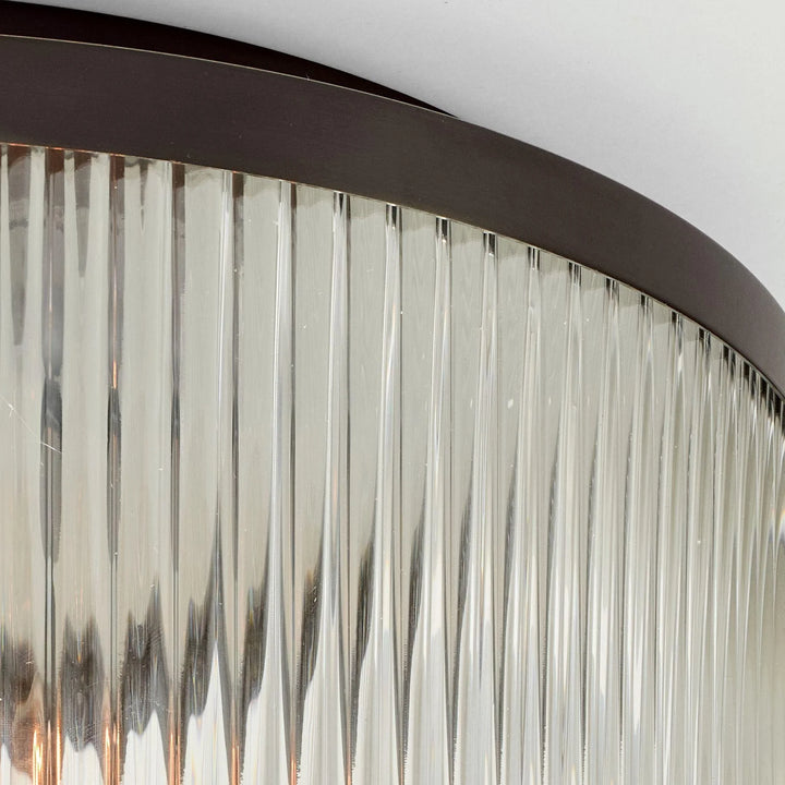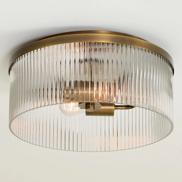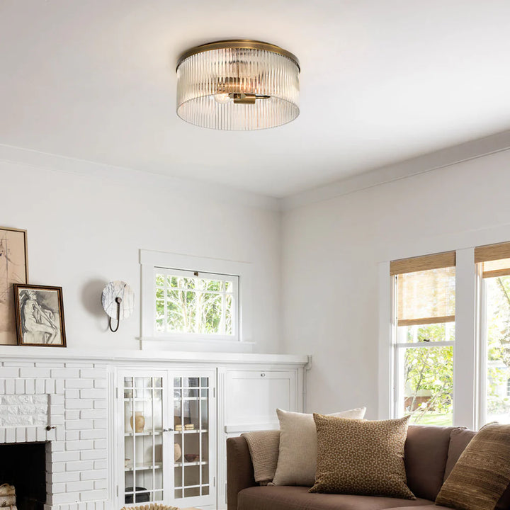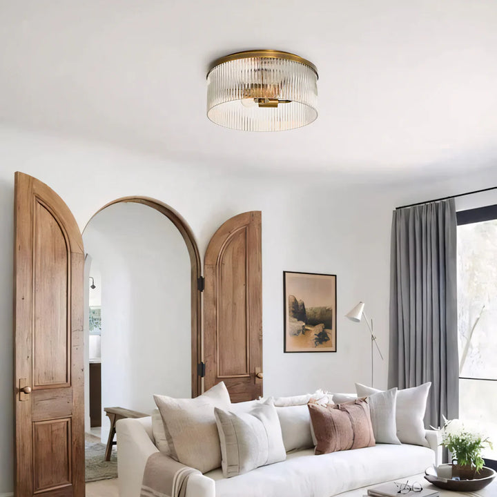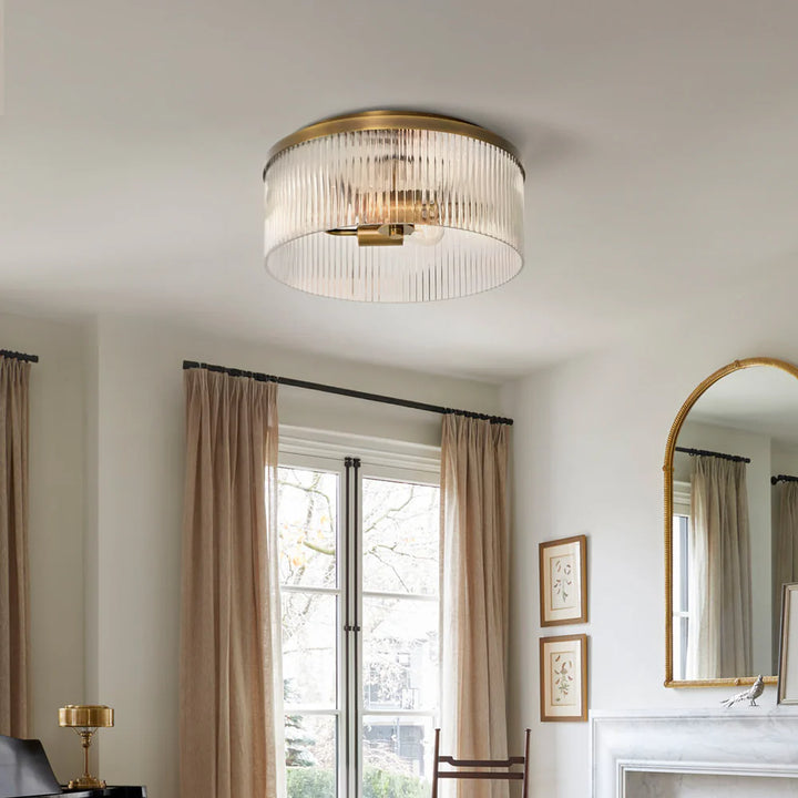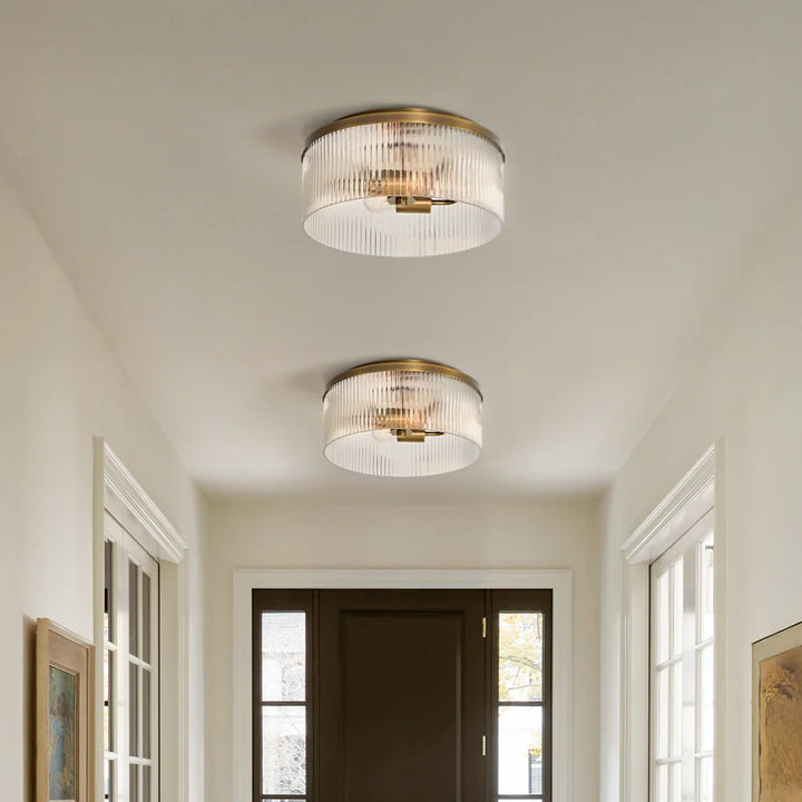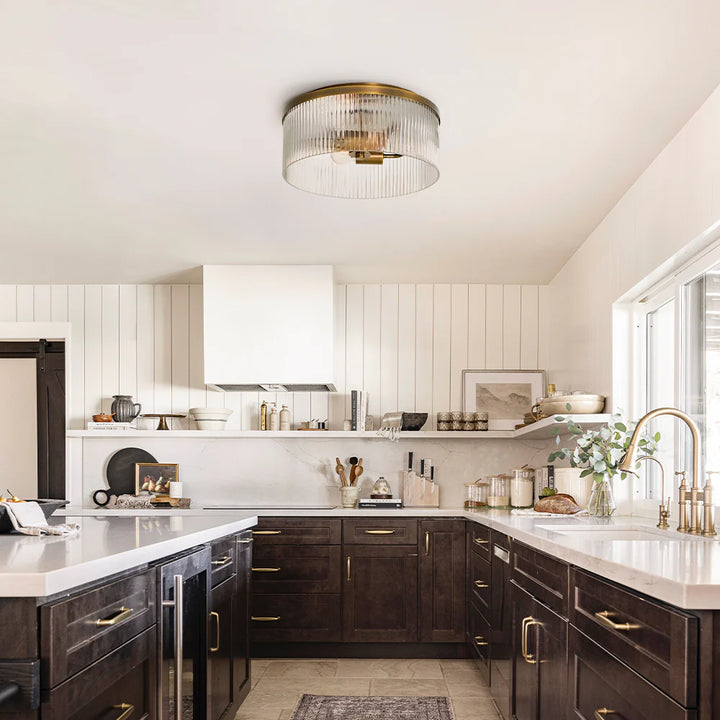 This recessed ceiling light exudes a rustic, sophisticated feel with its metal frame and ribbed details, paired with a fluted glass round shade. It's ideal for bedrooms, living rooms, kitchens, and more.