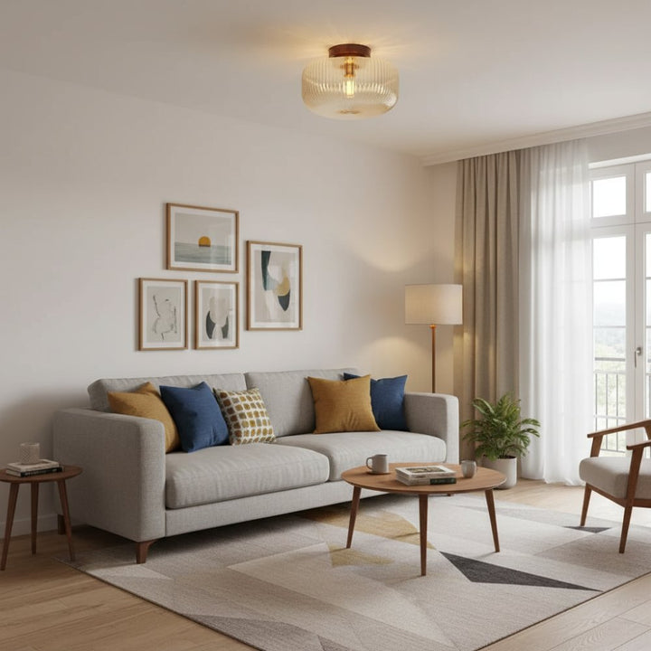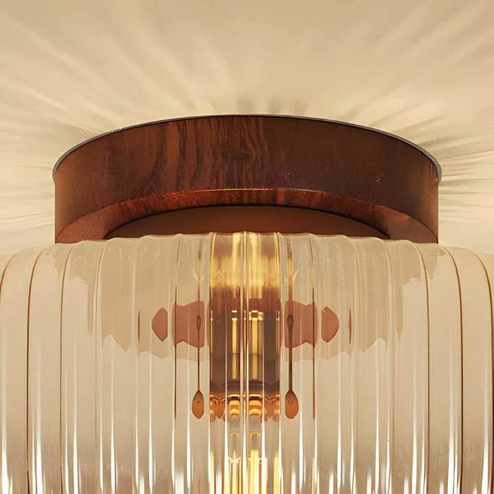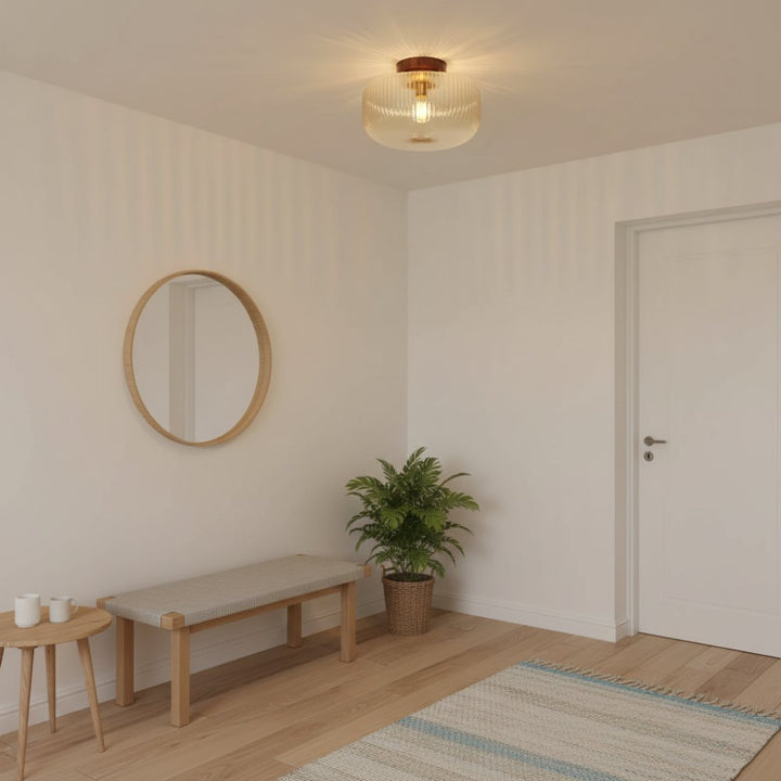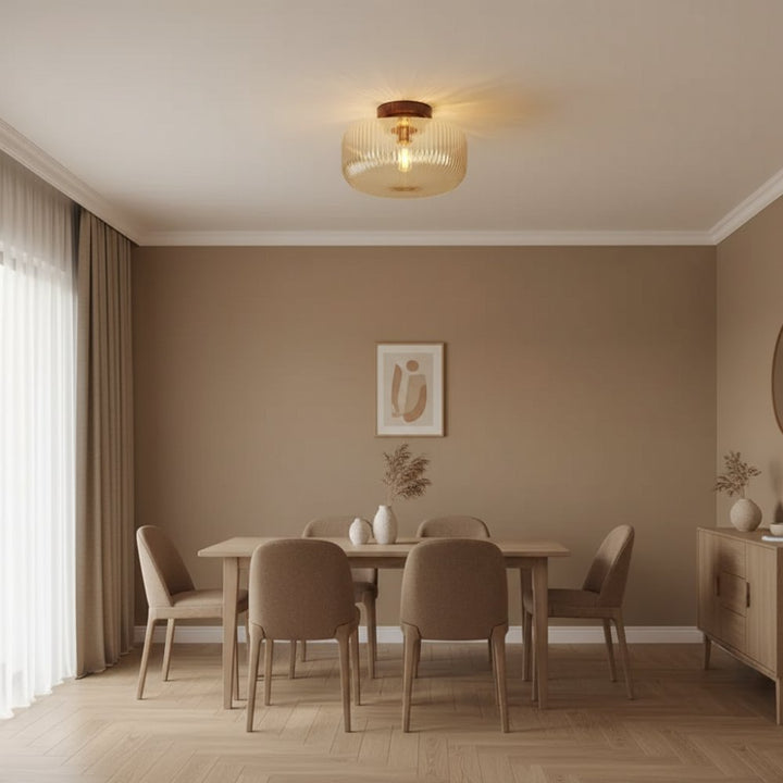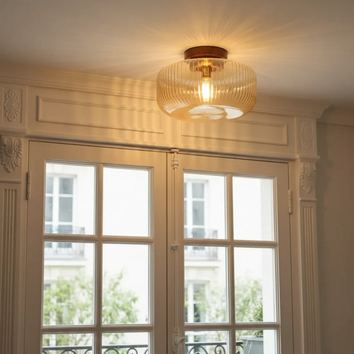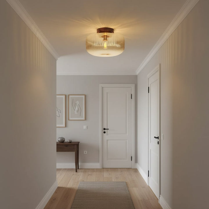 A vintage-style ceiling lamp, adorned with an amber glass lampshade and a wooden base, emitting a warm glow.