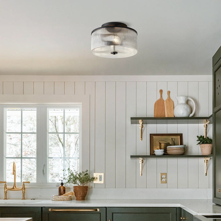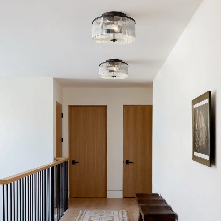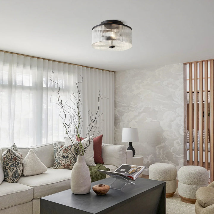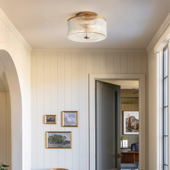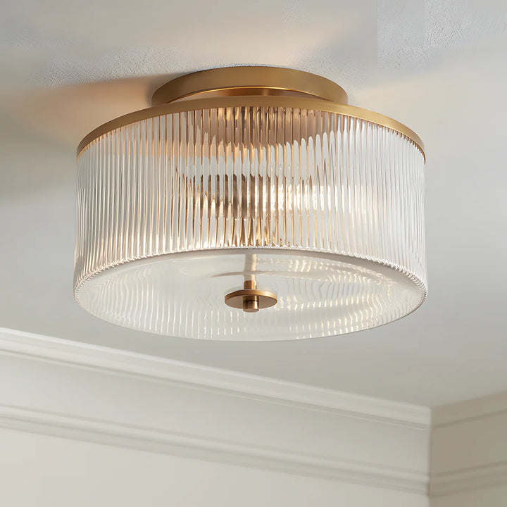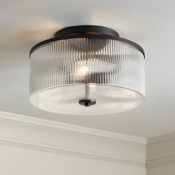 This semi-flush mount light is designed for low ceilings, featuring a striped glass drum that softens light and creates a warm, soft glow.