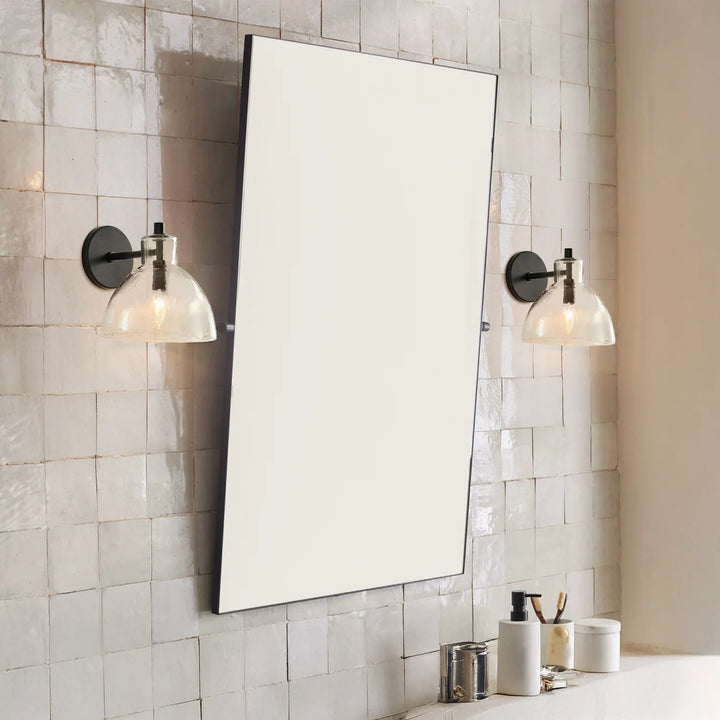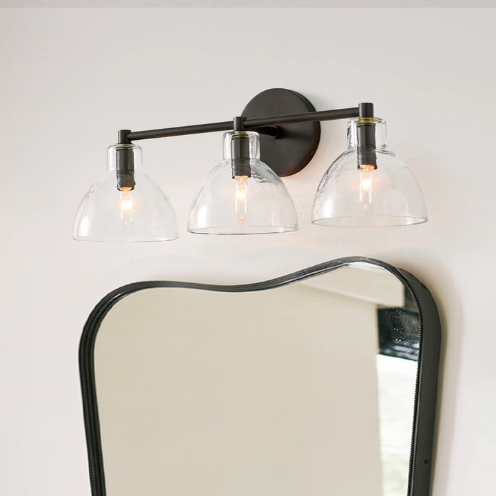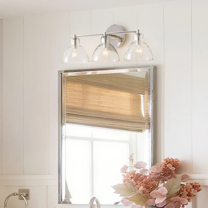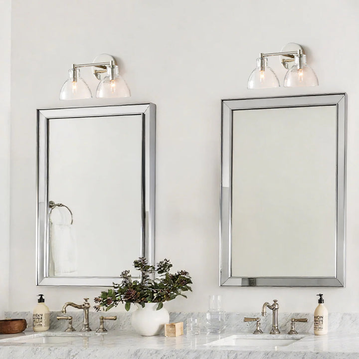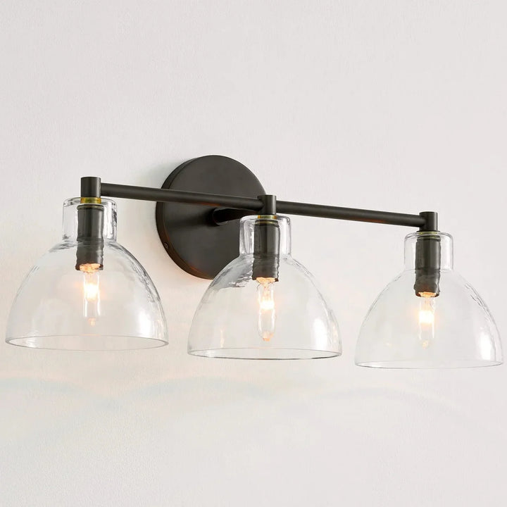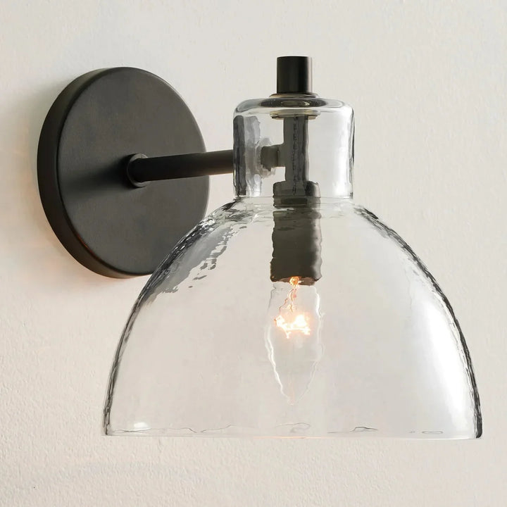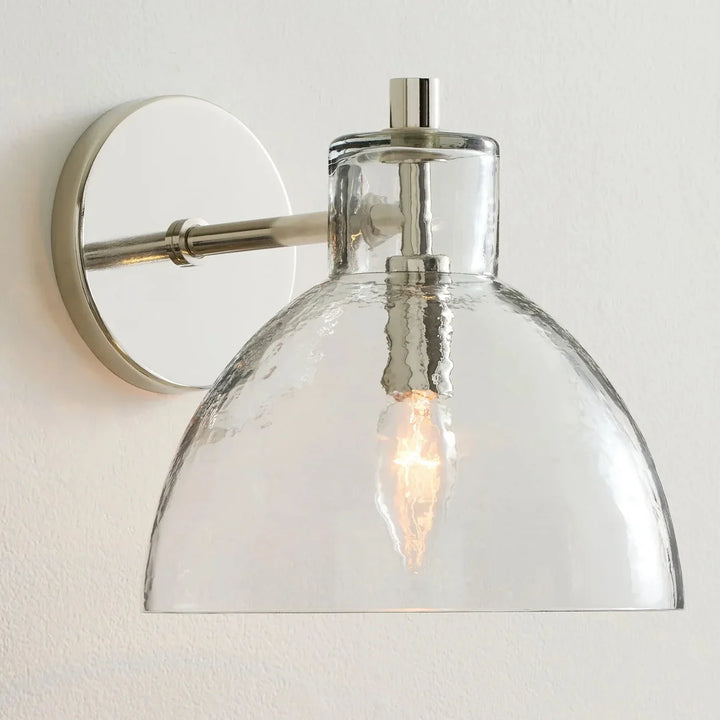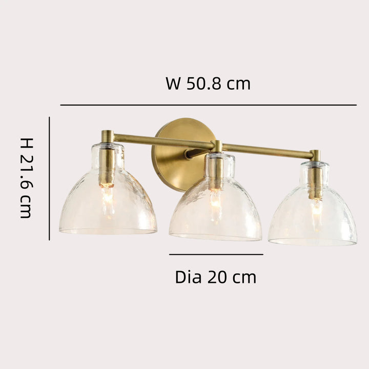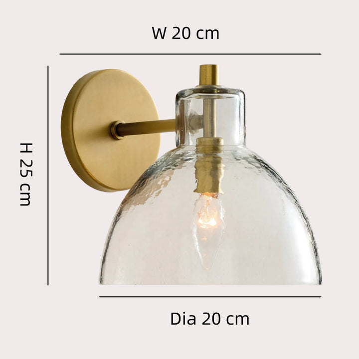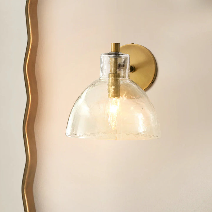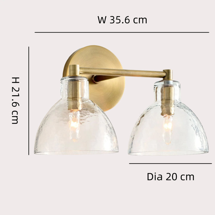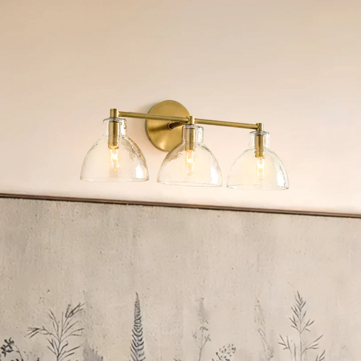 This lamp features a blown clear glass lampshade with a brushed brass finish. It is simple yet crafted, suitable for bathrooms, bedrooms, and other scenes. The open bottom design ensures ample light.
